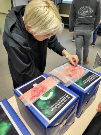 - Interactive Activity: Touch Boxes – “Can you guess where we hid the brain?” Visitors had the opportunity to touch and guess the nature of the brain. It was a hygienically packaged brain, not of human origin but from a pig. Correct guesses were rewarded with gummy brain candies. This station illustrated the complex mechanics of the brain and how it behaves differently when pressed or pulled.
