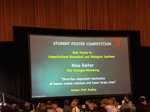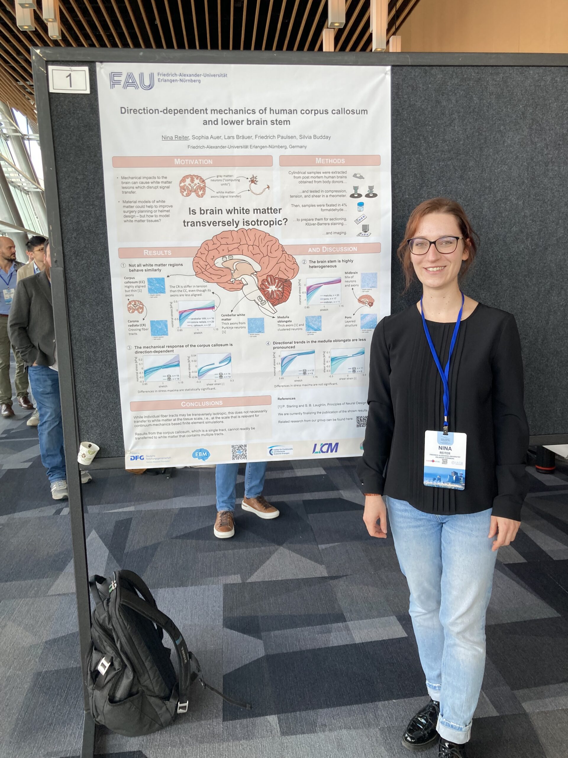 Exciting news from the WCCM 2024 conference in Vancouver! A big thank you to everyone who attended Dr.-Ing. Silvia Budday and Nina Reiter ‘s talks at the WCCM conference! Our BRAINIACS member Nina Reiter presented her research on the “Direction-Dependent Mechanics of Human Corpus Callosum and Lower Brain Stem” for which she won the student poster competition in the Computational Biomedical and Biological Systems category.