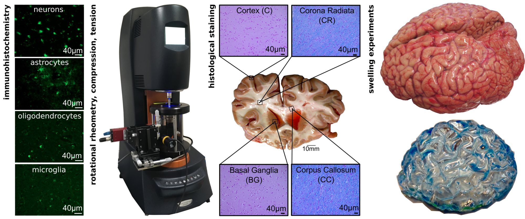 Biomechanical testing of ultrasoft tissues such as brain tissue is challenging as the response highly depends on length and time scales, the loading mode, strain and strain rate, or drainage conditions. Our goal is to establish an experimental procedure that minimizes falsifying effects, but also sufficiently covers loading scenarios relevant for real-life applications. We complement rheological, nanoindentation, and atomic force microscopy experiments performed at the LTM, FAU, with triaxial biomechanical testing at the Institute of Biomechanics, TU Graz, led by Prof. Gerhard A. Holzapfel, to thoroughly characterize animal and human brain tissue. Hand in hand with the mechanical modeling, we optimize the experimental procedures to assess the information required to establish realistic constitutive models and accurately calibrate the corresponding material parameters.