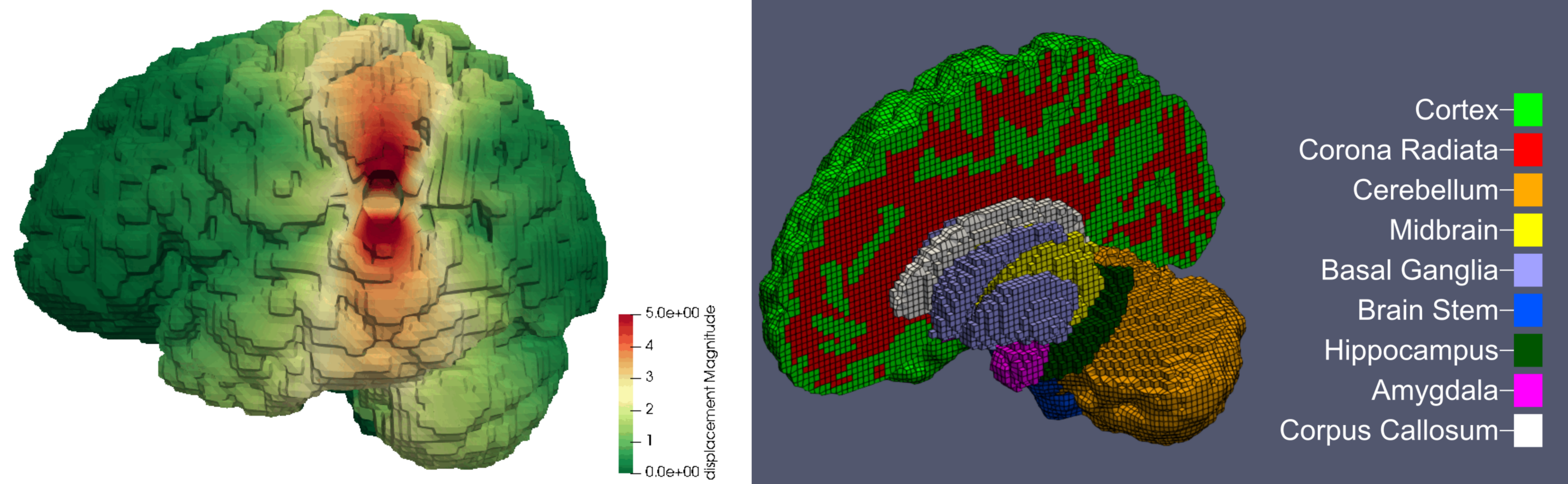 An important focus of our work is to investigate how different regions with different material properties affect the response of the model under various loading types. We have performed simulations of various surgical procedures (such as brain retraction) and biological processes (such as cerebral atrophy and tumor growth).