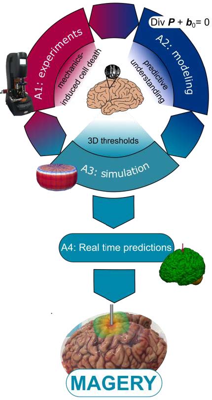 This project aims at revolutionising the treatment of brain disorders through mechanics-augmented brain surgery (MAGERY). Due to the ultrasoft nature of brain tissue, surgical procedures have exceptionally high requirements for minimal invasiveness and maximal safety. During the procedure, brain tissue largely deforms and is easily loaded beyond its functional tolerance. A promising technology to improve surgical outcomes is to integrate virtual information either through immersed virtual reality (VR) in training and planning or through augmented reality (AR) overlaying virtual information with the surgeon’s real view. Despite rapid advances, to date, most VR/AR solutions have disregarded the complex region-dependent mechanical properties of brain tissue and mechanics-induced cell dysfunction or death.